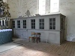 In der Ostwand des Chores ist ein gotischer Eucharistie-Schrank mit Tür und Giebelbogen eingebaut, der zur Aufbewahrung der Abendmahlsgeräte und wohl auch als Tabernakel diente. Ein gotisches Triumphkreuz, wohl Anfang 14. Jahrhundert, das ursprünglich unterhalb des Triumphbogens zwischen Kirchenschiff und Chor angebracht war, befand sich Anfang des 20. Jahrhunderts an einer Wand im Chor. Heute hängt es wieder an seinem ursprünglichen Ort. In den unteren mittleren Rechteckscheiben der Fenster im Langhaus befinden sich Familienwappen der Kirchenpatrone. Darunter sind Johann Ulrich und Engelke von Restorff sowie Daniel und Christoffer von Brüshaver.[19]