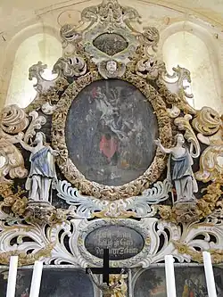 Das Altargemälde im ovalen Akanthusrahmen in dem prachtvoll geschnitzten Altaraufsatz um 1700 stellt die Kreuzabnahme Christi mit einer Kopie nach Peter Paul Rubens dar. In der Predella sind Gethsemane und die Grablegung dargestellt.[20]
