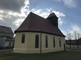 Der Kirchturm nimmt die volle Breite des Schiffs auf. Er kann durch eine ebenfalls rechteckige Pforte von Westen her betreten werden. Darüber ist ein schlichtes Kreuz sowie ein kleines, querrechteckiges Fenster. An der Nord- und Südseite sind zwei weitere Pforten. Der Giebel ist verbrettert. Darüber erhebt sich der ebenfalls verbretterte Turmhelm. Er hat an jeder Seite zwei kleine, paarweise angeordnete Klangarkaden. Darunter ist an der Nord-, Süd- und Ostseite eine ausmittig angebrachte Turmuhr. Der Helm schließt mit einem quergestellten Walmdach sowie Turmkugel und Wetterhahn ab.