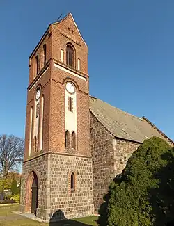 Der Westturm besteht aus unverputzten Backsteinen auf einem Feldsteinsockel. Er ist mit einem quer zur Gebäudeachse angeordneten Satteldach abgeschlossen, auf dem sich ein großes Turmkreuz erhebt. Glocken und eine in Funktion befindliche elektrisch angetriebene Kirchturmuhr sind ebenfalls vorhanden.