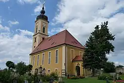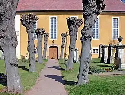 An der Kirche befindet sich der 1839 erweiterte Friedhof mit Grabdenkmälern des Klassizismus und Historismus; die Torpfeiler tragen Vasenaufsätze.