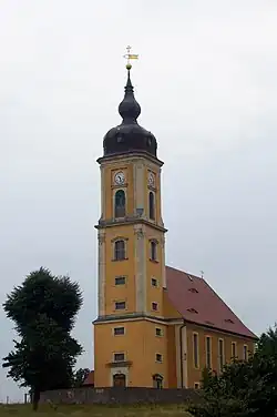 Die auf einer Anhöhe im ummauerten Friedhof gelegene stattliche Saalkirche wurde im Jahr 1769 unter Einbeziehung von Außenmauern des Vorgängerbauwerks erbaut. Der Turmunterbau wurde bereits im Jahr 1730 laut Inschrift am Westportal, das zweite Geschoss 1769 zusammen mit der Kirche errichtet, das dritte Geschoss 1769. Nach teilweiser Zerstörung im Jahr 1945 wurde in den Jahren 1945–1948 eine Innenrestaurierung durchgeführt.