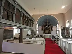 Aus einem Vorgängerbau müssen auch eine 1621 von den Brüdern Ernst und Albrecht von der Hagen gestiftete hölzerne Kanzel sowie die in die zweite Hälfte des 16. Jahrhunderts datierte Brüstung der Empore stammen. Auf die Emporenbrüstung wurden später in zwei Reihen, die vertikal durch Pilaster gegliedert sind, Wappen aufgebracht.[1]