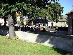 In unmittelbarer Nachbarschaft sind ein Gefallenendenkmal für die Gefallenen des Ersten Weltkrieges in Form einer dreiteiligen Stele und eine Sandstein-Felsplatte als Denkmal für die Opfer des Zweiten Weltkrieges zu finden.[18]