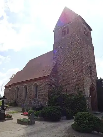 Die spätromanische Dorfkirche aus der Zeit um 1200 ist als Backsteinbauwerk mit Feldsteinfundament ausgeführt und besteht aus dem quadratischen, eingezogenen Westturm, dem rechteckigen Saal und dem eingezogenen, quadratischen Chor. Am Turm sind die gut erhaltenen, gekuppelten, rundbogigen Schallöffnungen und der unter den Feldsteingiebeln angeordnete Konsolenfries mit Zahnschnitt zu beachten. Der Ostgiebel ist schlicht und mit einem breiten Zahnschnittfries gegliedert. Im Jahr 1891 wurden das Schiff und der Chor erhöht, die Fenster verändert und die alten Portale vermauert. Im Jahr 1999 erfolgte eine Restaurierung. Im Nordportal ist ein Grabstein des Pfarrers Johann Weidemann aus dem Jahre 1728 eingemauert.[1] Das Innere ist flachgedeckt und wurde um 1959 renoviert.