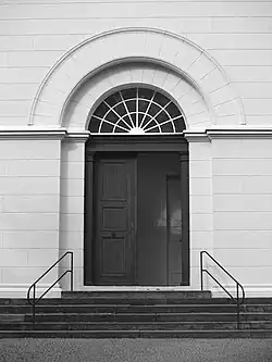Um den Bau herum ziehen sich, als horizontales Gegengewicht zu den vertikalen Elementen, zwei Kämpfergesimse und ein Kranzgesims. Die Fassade einschließlich der Turmabschlüsse ist orthogonal gestaltet. Um dieses System an der Eingangsseite nicht durch die Dachschrägen zu stören, wurde das eigentlich zwischen den Türmen befindliche Giebeldreieck durch eine oben horizontal abschließende Attika verdeckt.