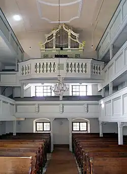 Die Orgel ist ein Werk von Johann Daniel Ranft aus dem Jahr 1785 mit ursprünglich 12 Registern auf einem Manual und Pedal. Eine Reparatur aus dem Jahr 1839 ist überliefert. Eine Weitere erfolgte im Jahre 1852 durch den Dresdner Orgelbauer Julius Immanuel Jehmlich (1826–1856).[1] Im Jahr 1896 wurden der Trompetenbass 8′ und die Quinte 3′ entfernt und stattdessen ein Cellobass 8′, ein Salicet 4′ und eine Gambe 8′ auf zusätzlicher Schleife eingebaut. Im Jahr 1917 wurden die Prospektpfeifen entfernt. Im Jahr 1927 erhielt die Orgel vermutlich ihren Zinkprospekt durch die Firma Jehmlich, außerdem wurde ein zweites Manual mit den Stimmen Flöte 8′, Aeoline 8′ und Salicet 4′ eingebaut. Im Jahr 1951 baute die Firma Eule Orgelbau Bautzen eine Quinte 2 2⁄3′ und an Stelle der Gambe 8′ ein Sifflet 1′ ein.[2] Georg Wünning stellte im Jahr 2010 die einmanualige Anlage wieder her und führte das Werk auf den ursprünglichen Zustand zurück. Die Disposition lautet:[3]