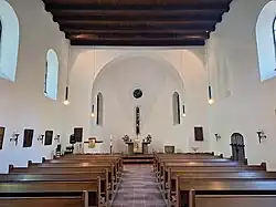 - Die Kirche hatte einen Vorgängerbau, der bei sonst gleichem Grundriss über einen schiffsbreiten Westquerturm verfügte. Er wurde vom Ausgräber unter Vorbehalt auf die Zeit „um oder gar vor 1200“ datiert.