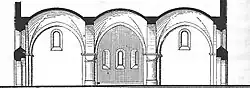 Über dem Joch des westlichen Quadrats wurde im 17. Jahrhundert ein spitzer, achtseitig behelmter Holzturm nachträglich aufgesetzt. Das mittlere Joch über der Vierung ruht auf mächtigen, aber sehr niedrigen Rundpfeilern.