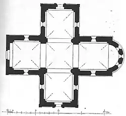 Der Bauplan der Kirche ist denkbar einfach und für mecklenburgische Verhältnisse genauso selten: Er besteht aus fünf gleich großen Quadraten, die zusammen ein Griechisches Kreuz bilden. Das Griechische Kreuz hat im Gegensatz zum Lateinischen Kreuz gleich lange Arme. Von der Planung her hätte die Kirche entsprechend zum gewohnten Lateinischen Kreuz erweitert werden können, indem vor das westliche Joch weitere Joche vorgesetzt worden wären. An das östliche Quadrat fügt sich eine halbrunde Apsis an. Wie etwa Zeitgleich bei der Klosterkirche des Klosters Sonnencamp in Neukloster, wurde hier der, mit dem Bau des Ratzeburger Dom in das ehemaligen Bistum Ratzeburg gelangte Stil der Backsteinromanik verwendet.[2] Dieser war kurz vor Baubeginn, etwa im Jahr 1220, vollendet worden.