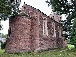 Die Dorfkirche steht an der Götschetalstraße. Sie wurde 1869 nach Entwurf des Architekten und hochrangigen preußischen Baubeamten Friedrich August Stüler fertiggestellt. Sie wurde aus Porphyrstein-Mauerwerk im neoromanischen Stil errichtet. Die Kirche hat ein abgestuftes Westportal, große Fenster am Kirchenschiff und einen Westquerturm mit kleinen Giebeln. Das Portal der Kirche ähnelt dem Portal der Klosterkirche auf dem Petersberg. Im Tympanon steht ein Bibelzitat: Nahet Euch zu Gott, so nahet Er sich zu Euch Jakob 4V8.