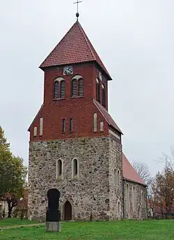 Ab dem Jahr 1438 wurde mitten auf dem Dorfanger die Dorfkirche aus Feldsteinen errichtet. Diese Jahreszahl konnte mittels späterer moderner dendrologischer Untersuchungen der alten eichenen Dachbalken festgelegt werden.[3] Anfangs trug das Kirchengebäude auf dem schiffsbreiten Westturm einen holzverkleideten Turmaufsatz, der im Jahr 1772 einem Brand zum Opfer fiel. Offenbar noch im gleichen Jahr erfolgten Ausbesserungs- und Umbauarbeiten, denn die Wetterfahne trägt die Jahreszahl 1772. Die Arbeiten umfassten auch das Zumauern einer zweiten Eingangstür in der Südfassade und den Einbau größerer Fenster. Die umfangreichen Bauarbeiten bewirkten eine Baustiländerung hin zur Frühgotik.