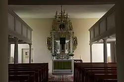Die Kirche ist ein verputzter Saalbau, der auf einem umlaufenden und ebenfalls verputzten Sockel errichtet wurde. Das Kirchenschiff erscheint in einem weiß-rosafarbenen Ton und besitzt einen rechteckigen Grundriss. An der Ostwand ist mittig ein gedrückt-segmentbogenförmiges Fenster mit einer aufgeputzten Laibung sowie oberhalb einem mittig angebrachten Schlussstein. Am Übergang zum Dach ist ein umlaufender Fries. An der Südseite des Langhauses sind fünf, an der Nordseite vier gleichartige Fenster. Dort ist mittig eine rundbogenförmige Pforte, darüber ein kleineres Fenster, das jedoch identisch gestaltet wurde.