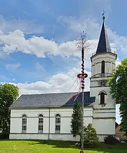 Das Gotteshaus befindet sich am Ende der zum Anger erweiterten Dorfstraße, nahe der linken Häuserseite auf einem kleinen Hügel. Es ist ein rechteckiger Saalbau mit quadratischem Westturm, der in den Jahren 1843 bis 1845 nach Abbruch der Vorgängerkirche erbaut worden ist. Aus der alten Kirche aus dem 15. Jahrhundert stammt der an der Südwand stehende spätgotische Altarschrein auch aus dem 15. Jahrhundert. Er besitzt höfische Schnitzfiguren in Gestalt der gekrönten Mondsichelmadonna mit Strahlenkranz, flankiert vom Heiligen Georg und der Heiligen Elisabeth von Thüringen.[1]