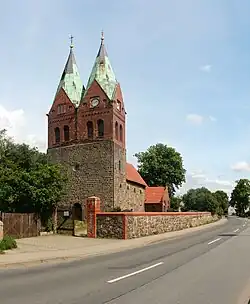 Die Kirche ist eine Saalkirche aus sorgfältig gequadertem Feldsteinmauerwerk mit eingezogenem Chor, Apsis und Westquerturm, aus dem zweiten Viertel des 13. Jahrhunderts; sie wurde gegen Ende des 15. Jahrhunderts eingewölbt. Der doppeltürmige Backsteinaufsatz des Westturms in frühgotischen Formen mit zwei kupfergedeckten Spitzhelmen und die neugotische Backsteinvorhalle im Süden stammen aus dem Jahr 1901, gleichzeitig wurden die Fenster spitzbogig vergrößert und das ganze Bauwerk neu verfugt.