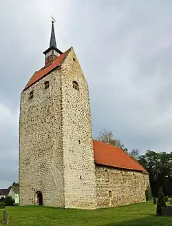 Die aus Feldsteinen errichtete vollständige Anlage einer romanischen Dorfkirche entstand nach einer dendrochronologischen Untersuchung um das Jahr 1204.[1] Vor dieser Untersuchung vermutete Horst Schölke als Bauzeit das Ende des 12. Jahrhunderts.[2] Der Grundriss des in das Kirchenschiff eingezogenen Chors ist quadratisch. An ihn schließt sich auf der Ostseite eine halbrunde Apsis an. Die Fenster- und Türöffnungen sind weitgehend noch im ursprünglichen Zustand erhalten. In der nördlichen Seitenwänd des Schiffs befindet sich ein rundbogiges Stufenportal mit Spurn mittelalterlicher Türbeschläge. Die Priesterpforte an der Nordseite des Chors hat erhalten Beschläge aus romanischer Zeit. Die Kirchenfenster sind noch hoch angesetzt, aber schon als leichte Spitzbögen ausgeführt, ein Zeichen beginnender Gotik. Da der gotische Magdeburger Dombau 1204/1206 noch nicht begonnen hatte, kommen als Vorbild am ehesten die beidseits spitzbogigen östlichsten Obergadenfenster des Braunschweiger Doms in Frage.