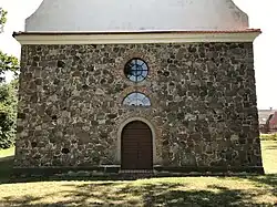 Die Kirche entstand im Wesentlichen aus Feldsteinen, die mäßig behauen und überwiegend lagig geschichtet wurden. Der Chor ist gerade und nicht eingezogen. Spuren von Ausbesserungsarbeiten am Chorschluss deuten darauf, dass sich dort ursprünglich eine Dreifenstergruppe befand. Das mittlere vormals rundbogenförmige Fenster ist zugesetzt und verputzt. Seitlich sind je ein großes Rundbogenfenster mit einer breiten ebenfalls verputzten Fasche. Sie gehen im oberen Bereich in ein verputztes, später aufgesetztes Geschoss über, in dem sich zwei weitere, hochrechteckige Fenster befinden.