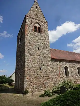 Die spätromanische Saalkirche besteht aus Westquerturm mit einer Mauerstärke von 1,80 m,[1] einem kurzen, gleich breiten Schiff und eingezogenem, leicht aus der Achse verschobenen Rechteckchor; sie wurde in Feldsteinmauerwerk erbaut und 1230 geweiht. Im Obergeschoss des Westturms sind spitzbogige Schallöffnungen mit rundbogigen Biforien und Backsteineinfassung eingelassen. Im Jahr 1737 wurden Umbauarbeiten vorgenommen, wobei die Chormauern und das Chordach erhöht,[2] die Fenster vergrößert sowie die romanischen Portale auf der Südseite vermauert wurden. Restaurierungen wurden um 1960 und 2002 durchgeführt.