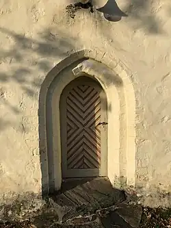 Das Bauwerk entstand im Wesentlichen aus Mischmauerwerk bestehend aus Feldsteinen und Mauerwerk, die anschließend mit einem groben Putz versehen wurden. Der Chor ist gerade und nicht eingezogen. An seiner Ostwand ist ein gedrückt-segmentbogenförmiges Fenster, dessen Gewände mit verputzten Mauersteinen eingefasst ist. Links und rechts steht auf einem Sockel je ein Epitaph. Im ebenfalls verputzten Giebel ist leicht ausmittig nach Norden hin ein kleines, hochrechteckiges Fenster.