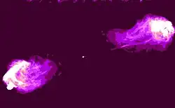 Double-Double Radio Galaxies entstehen, wenn eine Fanaroff-Riley Type II Galaxy neue Jets in den Raum sendet, bevor die alten Radio Lobes verschwunden sind.