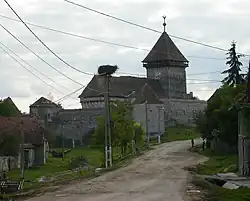 Die 8–9 Meter hohe Festungsmauer und die zum Teil eingestürzten sechs Wehrtürme der Kirchenburg bestehen aus Feldstein. Die Einfahrt zur Wehranlage liegt im Süd-Westen und wurde durch einen dreistöckigen Wehrturm, der zwei Fallgatter hatte, geschützt. Die Kirchenburg bestand nun aus einer Wehranlage, in deren Mitte die Kirche stand.[11][12]