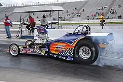 Die Motoren werden mit einem Gemisch aus 85–90 % Nitromethan und 15–10 % Methanol betrieben. Der Hubraum ist auf 8.193,5 cm³ (500 cui) begrenzt. Zum Einsatz kommen ausschließlich Stockblock-Motoren, konventionelle Achtzylinder-OHV-Viertaktmotoren mit untenliegender Nockenwelle und zwei Ventilen pro Zylinder. Die meisten Teams verwenden die Aluminium-Replika des bewährten 426 Chrysler Hemi-Motor aus den 1960er Jahren. Der Motorblock hat im Gegensatz zum Serienpendant jedoch keine Kanäle für Kühlflüssigkeit, da die Verdunstungskälte des Kraftstoffes während der kurzen Betriebsdauer zur Kühlung ausreicht. Zudem erhöht dies die Festigkeit des Motorblocks. Zylinderköpfe, Pleuel und die Kurbelwelle sind Spezialteile aus hochfesten Werkstoffen. Um das Gewicht der oszillierenden Massen, etwa der Pleuel, möglichst gering zu halten, wird auch das sehr leichte Titan verwendet. Zwei oder drei Zündkerzen pro Zylinder werden von einer Hochleistungszündanlage mit Spannung versorgt. Bereits zur Hälfte des Laufes dieselt der Motor, das heißt das Gemisch entzündet sich an den extrem heißen Auslassventilen von selbst. Die Motoren werden nahe der mechanischen Belastungsgrenze betrieben, nach jedem Lauf wird der Motor komplett zerlegt und untersucht. Schadhafte Teile wie Lager, Pleuel oder Kolben werden ausgetauscht. Der Kompressor verdichtet pro Sekunde mehr als 1 m³ Luft und presst die Ansaugluft mit einem Überdruck von bis zu 5 bar in die Brennräume. Das Nitromethan wird nicht vergast, sondern flüssig in die Brennräume eingespritzt. Bei Vollgas werden die Motoren nahe der hydraulischen Sperre betrieben. Über das Verhältnis von Nitromethan zu Ansaugluft wird die Leistung so eingestellt, dass die Räder gerade noch nicht durchdrehen.