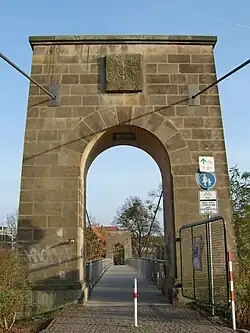 Die Hängebrücke über der Fulda, deren Spannweite 84 Meter misst, wurde 1870 als Fußgängerbrücke errichtet. Sie liegt direkt nördlich der 1926 erbauten Hessenkampfbahn und darf auch von Radfahrern genutzt werden. Durch die Brücke bekam der Auedamm am Nordende der Karlsaue eine Verbindung zur damals dicht bebauten Unterneustadt und diese neben der Fuldabrücke eine weitere Verbindung zum Stadtteil Mitte und damit zur Innenstadt.