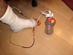 - Saugdrainage: Bei dieser Form wird der Sog grundsätzlich extern erzeugt. Zum einen werden sogenannte Vakuumflaschen (Unterdruckflaschen), so z. B. bei der Redondrainage, oder sich selbst expandierende Faltenbälge oder Plastikbälle (Jackson-Pratt-Drainage) verwendet, zum anderen echte Saugpumpen. Der Sog der „Vakuumflasche“ ist nur mit weiteren Hilfsmitteln direkt mess- und kontrollierbar, aber infolge des begrenzten Flaschenvolumens limitiert und nimmt mit zunehmender Füllung ab. Aber es gibt auch Unterdruckflaschen, die mit einer eigenen Handpumpe und einem Manometer versehen sind. Bei der Thoraxsaugdrainage (fälschlicherweise Bülau-Drainage genannt), die z. B. beim Pneumothorax nach Verletzung oder Operation im Brustkorb in Anwendung kommt, wird ein definierter Sog (meist 15–30 cm Wassersäule) wahlweise mit einer elektrisch betriebenen geregelten Pumpe oder mit einer anderen Saugpumpe erzeugt.