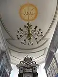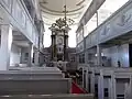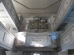Im Innenraum erwähnenswert Flachdecke, Emporen, Kanzelaltar, Orgel, Taufständer, Taufstein, Kruzifix.[3]
