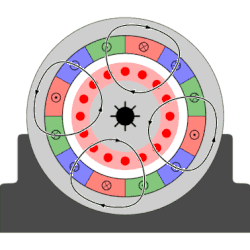 Der Motor besteht aus zwei Teilen, dem äußeren, feststehenden Ständer oder Stator und dem sich darin drehenden Läufer oder Rotor. Alternativ kann der Läufer auch um den Stator herumlaufen, wie es bei einem Radnabenmotor der Fall ist. Beidseits des schmalen Luftspalts fließen elektrische Ströme im Wesentlichen in axialer Richtung. Die Ströme sind in Spulendrähten konzentriert, die von weichmagnetischem Eisen umgeben sind. Das Eisen ist senkrecht zur Achse geblecht.