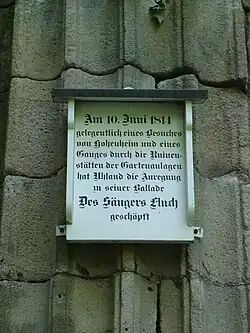 Seit 1810 beschäftigte sich Ludwig Uhland mit dem Stoff der schottischen Romanze „Der eifersüchtige König“, die Johann Gottfried Herder in seinem Sammelwerk „Volkslieder“ veröffentlicht hatte.[8] Uhlands Projekt, daraus ein Drama zu gestalten, gedieh nur zu einem Fragment. Am 10. Juni 1814 begleitete er seinen Freund, den Rechtsanwalt Albert Schott nach Plieningen, der dort einen Termin auf dem Rathaus wahrzunehmen hatte. In seinem Tagebuch hielt Uhland fest, dass er anschließend einen Spaziergang mit Schott in den Hohenheimer Anlagen unternahm, die sich damals bereits in einem halbzerfallenen Zustand befanden. Drei Tage später notierte er: „Neues Auffassen der Romanze vom zerstörten Königsschloß“. Am 3. Dezember meldete er: „Angefangene Ausarbeitung der schon früher entworfenen Ballade: Des Sängers Fluch. Die Ballade bis auf Einiges beendet.“[9]