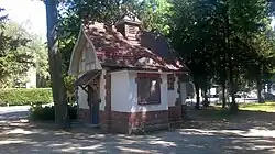 Am Rande des Parks hin zur Frankfurter Straße steht ein pittoreskes Häuschen, welches ehemals als öffentliche Toilette genutzt wurde. Der eingeschossige Massivbau wurde 1906 errichtet.[4] Er ist verputzt mit rustiziertem Sockel, Eckquaderungen und Gewänden in Sandstein. Markantes Merkmal des Gebäudes ist das hohe Schiffskehldach mit Entlüftungshaube und Fledermausgaube. Die Giebelseiten sind in konstruktivem Fachwerk ausgeführt. Da das Bauwerk als aufwändig gestalteter Zweckbau von bautypologischem und geschichtlichem Wert ist, steht es unter Denkmalschutz.[16]
