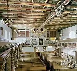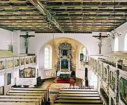 Das Innere ist von der barocken Ausmalung und Ausstattung geprägt. Der Saal ist mit einer barocken Kassettendecke mit 240 ornamental und vegetabil bemalten Feldern geschlossen. Eingeschossige Emporen umgeben den Raum an drei Seiten, die Brüstungen sind mit geschnitztem Rankenwerk verziert; zwischen gedrehten Säulchen sind 30 Szenen aus dem Alten und dem Neuen Testament dargestellt und mit der Jahreszahl 1654 bezeichnet. Ein Triumphbogen aus dem Jahre 1896 vermittelt zum Chor.