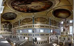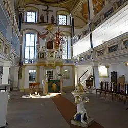 Das Deckenbild ist ein Bild über Martin Luther und die Wandbilder von Maria und Johannes über dem farbig gestalteten Kanzelaltar aus dem Jahr 1745. Ein spätmittelalterliches Kruzifix aus dem 16. Jahrhundert stammt vom Vorgängerbau.[2] Der Westturm ist quadratisch mit geschweifter Schieferhaube und hoher Laterne.
