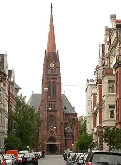 In den Jahren 1880 bis 1883 errichtete ein Vertreter der hannoverschen Bauschule des 19. Jahrhunderts, der Hase-Schüler Christoph Hehl, einen Kirchenbau im neugotischen Stil. Wegen der besonderen Lage der Kirche an der Westseite der Bödekerstraße bekam der Turm mit dem Haupteingang seinen Platz im Osten und der Altarraum seinen Platz im Westen der Kirche. Über dem Haupteingang ist eine von Carl Dopmeyer aus Sandstein gehauene Darstellung zu sehen. Das romantische Altarbild „Christus auf dem Meere“ von Bernhard Plockhorst stiftete der Kirchenvorsteher und Kapitän Julius von Alten.