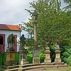 - Skulpturengruppe Mariensäule aus Brunnersdorf (Prunéřov) mit vier Heiligen-Statuen rechts von der Kirche