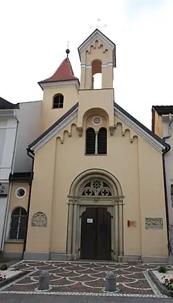 Die kleine, nach Westen ausgerichtete Renaissancekirche aus dem 16. Jahrhundert wurde mehrmals umgebaut. Um 1900 wurde die Ostfassade mit einem Giebelreiter und einem neoromanischen Portal hinzugefügt. Zwei eingemauerte Epitaphe stammen aus der zweiten Hälfte des 16. Jahrhunderts. An der Südseite erhebt sich ein barocker Glockenturm. Der dreijochige, mit Kreuz- und Flachkuppelgewölbe ausgestattete Innenraum besitzt im westlichen Joch zwei seitliche Konchen und barocke Fensteröffnungen.
