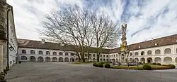Die Dreifaltigkeitssäule wurde von 1736 bis 1739 unter dem Abt Robert Leeb (1688–1755) von Giovanni Giuliani (1664–1744) und seiner Werkstatt mit dem Bildhauer Elias Hügel (1681–1755) und dem Steinmetzen Johann Georg Deprunner († 1740) errichtet. Die Säule wurde 1986/1987 restauriert.