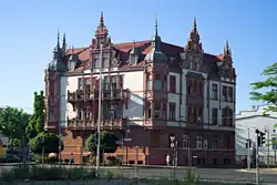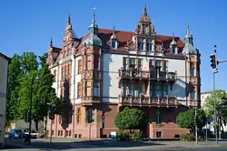 Die Eingangsfront ist gestalterisch sehr hervorgehoben. Hier findet man sechseckige Eckerker unter Welschen Zinkhauben mit Laterne und Wetterfahne. An den Erkern werden stilistische Mittel der Seitenfassade und Zwerchgiebel wieder aufgenommen. Der Hauszugang ist in der Mitte angeordnet und besitzt einen baldachinartigen imposanten Balkon mit einer massiven Brüstung. Diese Brüstung hat ovale volutenumspielte Medaillons zwischen kugelbesetzten Pfosten. Der Balkon des zweiten Geschosses besitzt eine schmiedeeiserne Brüstung. Das hohe Portal hat eine besondere Wirkung durch den Schulterbogensturz an der Tür. Die in das Oberlichtfenster eingreifende ornamentale Bekrönung und der Rosettenschmuck an den Portalgewänden tragen dazu bei. Die viergeschossige Hofseite ist kalksandsteinsichtig und mit roten Ziegelbändern versehen. An den Langseiten befinden sich Balkone.