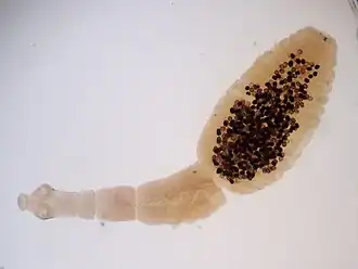 Der dreigliedrige Hundebandwurm (Echinococcus granulosus; früher Taenia echinococcus), oft einfach nur als „Hundebandwurm“ bezeichnet, gehört zu den bei Hunden, Wölfen,[1][2] Füchsen und anderen Hundeartigen sowie im Dachs und bei Katzen auftretenden Bandwürmern. Die Fleischfresser, in deren Dünndarm er heranwächst und lebt, dienen als Endwirt. Als Zwischenwirt dienen vor allem wildlebende, pflanzenfressende Wiederkäuer, aber auch Hausrinder, -schafe, -ziegen, -schweine, -pferde, -esel sowie Kamele, Kaninchen, Affen. Der Mensch ist für den Hundebandwurm ein Fehlwirt, da von ihm aus i. d. R. kein weiterer Zyklus erfolgt. Es existieren verschiedene Stämme des Hundebandwurms, die jeweils unterschiedliche Zwischenwirte bevorzugen.