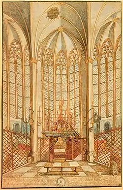 Auf der Abbildung von 1633 wird im Übrigen ein weiteres Ereignis dokumentiert, das 1434 die Gemüter erregte und Legendenbildung förderte: Ein großer Stein – das Stück einer Fiale – fiel durch das Dach der Kathedrale in die Kapelle und verfehlte den Schrein knapp, was schon bald als Wunder kolportiert wurde. Als Sicherungsmaßnahme wurde der Schrein danach für sechs Wochen in der Sakristei aufbewahrt.