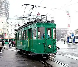 V-förmiges Dreilicht-Spitzensignal bei einem Basler Tramwagen