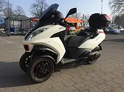 Bereits in den 1950er Jahren experimentierte Wolfgang Trautwein mit dreirädrigen Motorrädern, die sich mittels eines parallelogrammartigen Mechanismus auch neigen konnten – siehe auch Pendelgespann. 2006 stellte Piaggio den MP3 vor, der diese Ideen ebenso aufgriff, wie Peugeot mit dem Metropolis. Der Scooter verfügt über ein einzelnes, herkömmlich angetriebenes Hinterrad und über zwei Vorderräder, die im Abstand von 42 Zentimetern zueinander stehen und durch eine komplexe Parallelogrammaufhängung verbunden sind. Der Fahrer sitzt wie auf einem üblichen Motorroller, dem auch die Fahrdynamik – mit Schräglage in den Kurven – weitgehend entspricht. Der Motorroller darf bei Verbreiterung der vorderen Spur auf mehr als 46 cm mit der EU-Fahrerlaubnis der Klasse B, also mit dem PKW-Führerschein gefahren werden, sofern die Fahrerlaubnis vor dem 19. Januar 2013 erteilt wurde. Abgesehen von dieser Bestandsschutzregelung ist seit diesem Datum zum Führen eines Dreirad-Rollers ein Motorradführerschein (Klasse AM für bis zu 45 km/h, Klasse A1 für bis zu 15 kW oder Klasse A für mehr als 15 kW Motorleistung) erforderlich.[10]