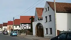 Vorne zur Straße wird der Dreiseithof durch einen rundbogigen Torbogen in einer rechteckigen Mauer abgeschlossen, darin ein rechteckiges, zweiflügeliges Holztor mit einer mittigen Schlupftür. Das sandsteinerne Gewände des Torbogens zeigt „ab ca. 1 m Höhe eine Phase an der Vorderkante, ein in der Zeit der Renaissance übliches Detail bei Türen und Fenstern.“[1] Den oberen Rundbogen füllt jeweils eine gedrückt erscheinende Verlängerung des Torflügels in der Form einer Viertel Sonnendarstellung mit sieben Strahlen aus. Am Fuß der Torpfeiler finden sich in der Einfahrt Prellsteine.