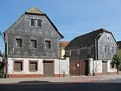 „[A]bgewitterte[…] Betondachsteine“ bedecken die Dächer, die ehedem wohl „mit Biberschwanzziegeln gedeckt gewesen sein“ dürften.[2]
