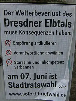 - ↑ Mehrheit der Dresdner hält den Welterbetitel für verzichtbar ( vom 20. Februar 2017 im Internet Archive). In: Sächsische Zeitung, 20. Juni 2009.