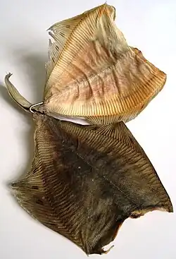Für die Herstellung des Trockenfisches werden die Schollen zerteilt – wobei der Kopf und die Innereien entfernt werden. Anschließend werden die Fische gesalzen und paarweise (an der Schwanzflosse zusammengebunden) auf Leinen im Freien getrocknet.
