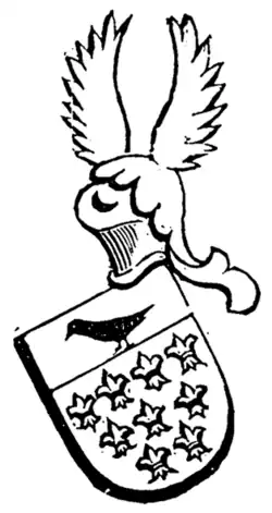 Blasonierung: Der Schild von Gold und Schwarz geteilt. Oben eine schwarze Merle, unten neun (4:3:2) goldenen Gleven. Auf dem Helm ein offener Flug, der rechte Flügel ist schwarz, der linke golden, dazwischen die Merle. Die Helmdecken sind schwarz-golden.[4][5]
