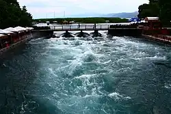 Kurz nach der Staumauer trennt sich der Drin in der Küstenebene Nordalbaniens durch Bifurkation. Bodensenkungen oder Hochwasser in den Jahren 1848, 1858/59 und 1896 führten dazu, dass die Mehrheit der Wassermassen sich einen neuen Weg suchte,[7][8][9] der vermutlich mit dem Verlauf im Altertum einigermaßen übereinstimmen dürfte.