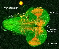 Die Pilzkörper sind zusammengesetzt aus Calyx und Pedunculus und sind der Sitz von höheren integrativen Leistungen, wie olfaktorisches Lernen und Gedächtnis. Dies konnten verschiedene Arbeitsgruppen z. B.durch transgene Techniken in rutabaga-Mutanten zeigen.[13][19]